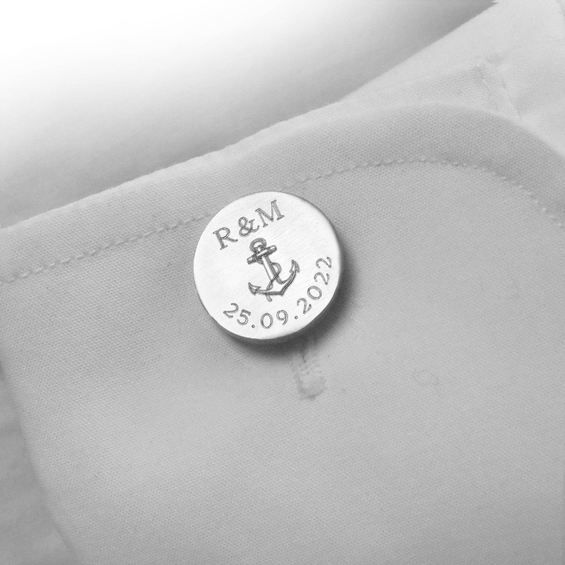 Elegante, runde Manschettenknöpfe aus hochwertigem Edelstahl mit Anker-Motiv in der Mitte. Oben können Initialen graviert werden, unten ein Datum, ein Name oder ein kurzes Wort. Die matt gebürstete Oberfläche sorgt für einen stilvollen Look, der perfekt zu festlichen Outfits wie Anzug oder Smoking passt – ideal auch für den Bräutigam zur Hochzeit.